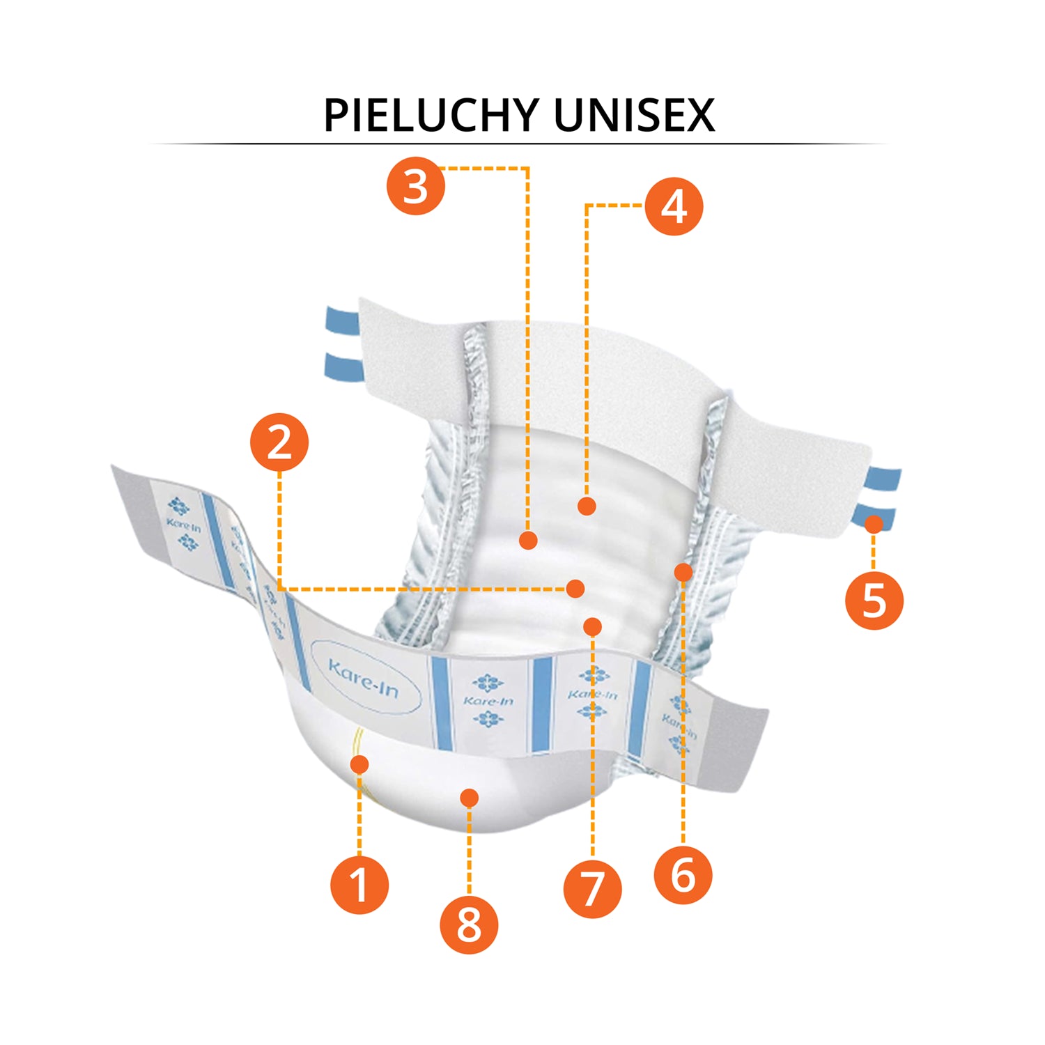 Warstwa dystrybucji płynów poprawia dyfuzję i zapobiega ponownemu zwilżeniu, co jest istotne dla utrzymania suchości. Rzepy pozwalające na wielokrotne regulacje, aby zapewnić komfortowe dopasowanie, a mankiety zapewniają doskonałe przyleganie i ochronę przed przeciekaniem.