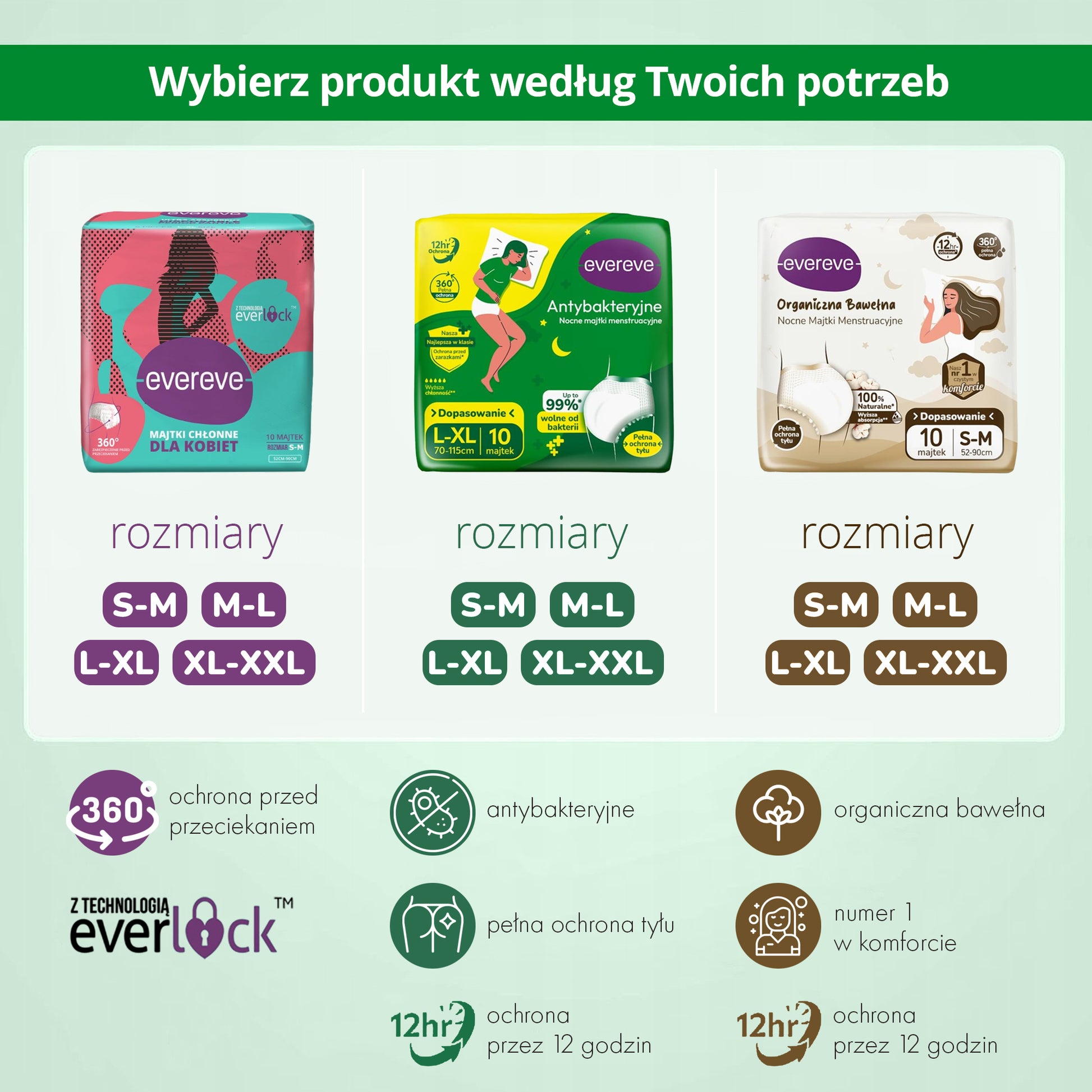 Majtki są super-chłonne, technologia pozwala na blokowanie nadmiaru płynu. Pozwalają na wchłanianie o pojemności do 3 razy większej niż w przypadku tradycyjnych podpasek. Majtki chłonne Evereve mają komfortowe dopasowanie, łącząc zalety zwykłych majtek i podpaski w jednym produkcie.