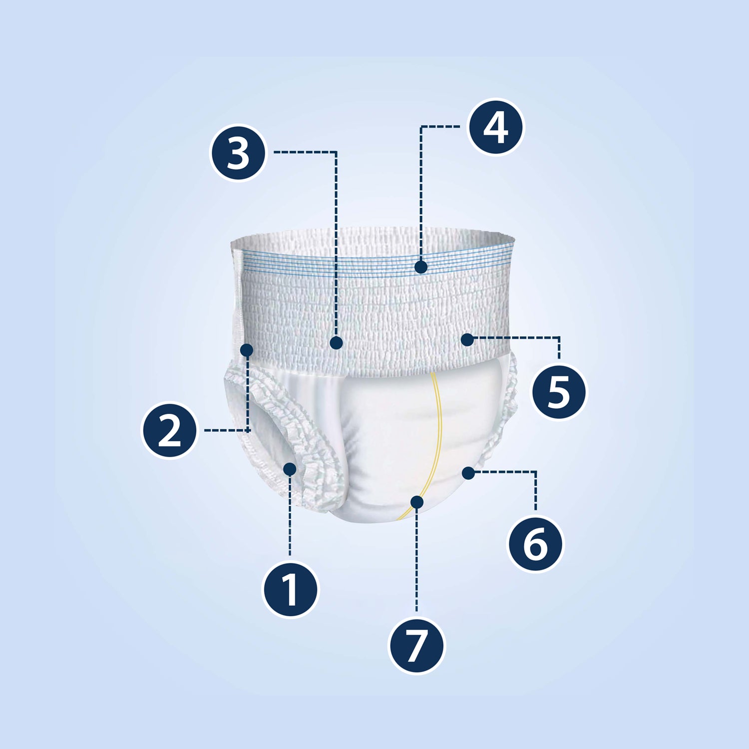 Super absorbentny rdzeń żelowy skutecznie zamyka płyny i pomaga eliminować nieprzyjemne zapachy, a kolorowy pas w talii wskazuje przednią część pieluchomajtek, ułatwiając ich zakładanie. Mankiety na nogach zapewniają dobrze dopasowany i bezpieczny krój, zapewniając ochronę przed przeciekaniem.