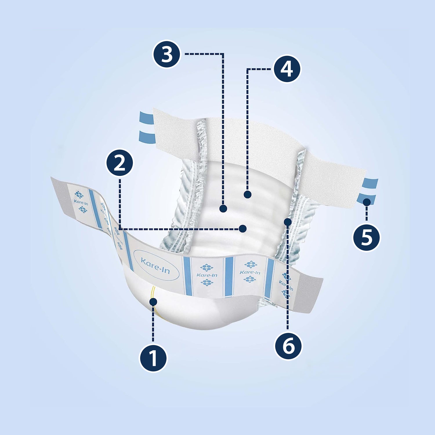 5. Wskaźnik wilgotności: Pieluchy KareIn są wyposażone we wskaźnik wilgotności, który poinformuje Cię, kiedy nadszedł czas na zmianę pieluchy.